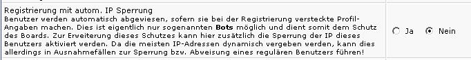 Alle extra Profilangaben wie Homepage, Beruf, Wohnort , Interessen und Signatur (mehr gibt's bei mir halt nicht) werden bei Registrierung erstmal ausgeblendet und statt dessen ein Hinweistext angegeben, das nach erfolgreicher Registrierung mehr Angaben gemacht werden können. Sollte nun ein "Bot" sich dennoch mittels versteckter Eingaben hier anmelden wollen wird er geblockt und zudem die IP-Adresse gebannt...nett, oder? :-)