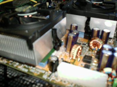 Weil das Teil aber ein teures Dualboard von ASUS war, wollte der dortige Techniker wohl das Geld sparen (und den Anschiss vom Chef *g*), und hat den Lüfter mit HEISSKLEBER festgemacht.